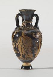 Keywords: Bulas Group - Miniature Panathenaic Amphora - Walters 4859 - Back.jpg This amphora with a flaring offset mouth depicts Poseidon and Athena on one side and Hermes on the other Poseidon stands in profile to the right with his left foot propped up on a rock and his left arm bent and resting on his left knee In his right hand he holds a trident upright which extends into the ornament above A mantle is draped around his back right thigh and over his left leg Athena stands to the left holding a spear upright in her right hand and she has a shield with a Gorgoneion and a star device on her left arm She wears a peplos girded at the waist necklace bracelet and Attic helmet Hermes is depicted standing to the left He holds a kerykeion in his right hand at waist level and wears a pestasos chlamys and mask Behind him is a stele on which his left arm rests while to the left and right are olive trees which fill the areas underneath the handles The subject matter is not the usual for Panathenaic amphorae which normally have Athena on one side and athletes on the other Poseidon and Athena are here depicted calmly standing and facing one another on the front a juxtaposition which brings to mind their contest for the city of Athens This story is first known to have been depicted in the west pediment of the Parthenon but there is no sign of strife in our scene If Hermes wears a mask as the black line running from his chin up suggests the scene may in some way have been influenced by a dramatic performance The generally poor quality of drawing however makes it impossible to determine if the painter meant to indicate a mask or not The olive trees beneath the handles are approporiate fillers because of the tree's association with Athena the story of the contest Panathenaic ampohorae and the Panathenaia early 4th century BC Classical terracotta cm 8 8 4 6 h x max diam ; at rim cm 2 55 diam ; at foot cm 1 8 diam accession number 48 59 13939 Don Marcello Massarenti Collection Rome 1897 cat no 153 Henry Walters city Baltimore Walters Art Museum Henry Walters Acquired by Henry Walters with the Massarenti Collection 1902 Goddess and Polis The Panathenaic Festival in Ancient Athens Hood Museum of Art Hanover; Tampa Museum of Art Tampa; Virginia Museum of Fine Arts Richmond; Princeton University Art Museum Princeton 1992-1993 place of origin Greece Walters Art Museum license Ancient Greek red-figure pottery in the Walters Art Museum Miniature Panathenaic amphoras Media contributed by the Walters Art Museum needs category review Bulas Group Hermes in ancient Greek pottery 4th-century BC festivals |