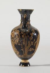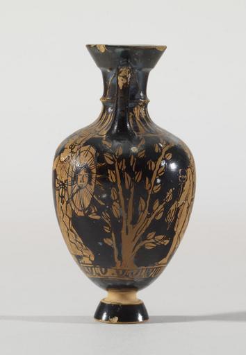 Keywords: Bulas Group - Miniature Panathenaic Amphora - Walters 4859 - Left.jpg This amphora with a flaring offset mouth depicts Poseidon and Athena on one side and Hermes on the other Poseidon stands in profile to the right with his left foot propped up on a rock and his left arm bent and resting on his left knee In his right hand he holds a trident upright which extends into the ornament above A mantle is draped around his back right thigh and over his left leg Athena stands to the left holding a spear upright in her right hand and she has a shield with a Gorgoneion and a star device on her left arm She wears a peplos girded at the waist necklace bracelet and Attic helmet Hermes is depicted standing to the left He holds a kerykeion in his right hand at waist level and wears a pestasos chlamys and mask Behind him is a stele on which his left arm rests while to the left and right are olive trees which fill the areas underneath the handles The subject matter is not the usual for Panathenaic amphorae which normally have Athena on one side and athletes on the other Poseidon and Athena are here depicted calmly standing and facing one another on the front a juxtaposition which brings to mind their contest for the city of Athens This story is first known to have been depicted in the west pediment of the Parthenon but there is no sign of strife in our scene If Hermes wears a mask as the black line running from his chin up suggests the scene may in some way have been influenced by a dramatic performance The generally poor quality of drawing however makes it impossible to determine if the painter meant to indicate a mask or not The olive trees beneath the handles are approporiate fillers because of the tree's association with Athena the story of the contest Panathenaic ampohorae and the Panathenaia early 4th century BC Classical terracotta cm 8 8 4 6 h x max diam ; at rim cm 2 55 diam ; at foot cm 1 8 diam accession number 48 59 13939 Don Marcello Massarenti Collection Rome 1897 cat no 153 Henry Walters city Baltimore Walters Art Museum Henry Walters Acquired by Henry Walters with the Massarenti Collection 1902 Goddess and Polis The Panathenaic Festival in Ancient Athens Hood Museum of Art Hanover; Tampa Museum of Art Tampa; Virginia Museum of Fine Arts Richmond; Princeton University Art Museum Princeton 1992-1993 place of origin Greece Walters Art Museum license Ancient Greek red-figure pottery in the Walters Art Museum Miniature Panathenaic amphoras Media contributed by the Walters Art Museum needs category review Bulas Group |
