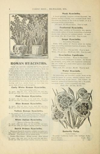 | Keywords: Bulbs and plants (15768350413).jpg  CURRiE BROS MILWAUKEE WIS <br> ROMAN HYACINTHS <br> These are specially valuable for forcing and-pot <br> culture in the house each bulb producing from two <br> to six spikes of dainty very fragrant flowers <br> If planted early in September they can be had in <br> flower in November and by keeping them under cov- <br> er and bringing into the light when wanted a suc- <br> cession of bloom may be had until May They are <br> not considered hardy as far north as this but by pro- <br> tecting well from severe frosts we have had very <br> pretty beds of them early in spring <br> Early White Roman Hyacinths <br> Selected strong bulbs <br> 5c each; 40c per doz or by mail 50c per doz ; <br> 3 00 per 100 purchaser paying express charges <br> Pink Roman Hyacinths <br> 5c each; 35c per doz or by mail 45c per doz ; <br> 2 50 per 100 purchaser paying express charges <br> Blue Roman Hyacinths <br> 4c each; 30c per doz or by mail 40c per doz ; <br> 2 25 per 100 purchaser paying express charges <br> Yellow Roman Hyacinths <br> A very pretty color of recent introduction 7c each; <br> 60c per doz or by mail 75c per doz ; 4 00 <br> per 100 purchaser paying express charges <br> White Italian Hyacinths <br> Similar to Roman Hyacinths <br> 5c each; 35c per doz or by mail 45c per doz ; <br> 2 50 per 100 purchaser paying express charges <br> Dutch Roman Hyacinths <br> Miniature Dutch Hyacinths suitable for early forc- <br> ing each bulb giving one or more neat little spikes <br> of bloom Very pretty in cut lower work <br> Single ” Red mixed White mixed Blue mixed <br> 6c each; 50c per doz or by mail 60c per doz ; <br> 4 00 per 100 purchaser paying express charges <br> Musk Hyacinths <br> A dwarf-growing purplish-colored Hyacinth the <br> flowers having a strong very pleasant musk odor <br> Excellent for clumps in the lawn or border or as a <br> pot plant for the conservatory <br> 10c each; 1 00 per dozen Free by mail <br> Feathered Hyacinths <br> Unlike other varieties of Hyacinths this species <br> forms pretty spikes of bloom resembling a feathered <br> plume very effective for outdoor culture 3c each; <br> per dozen 25c; 1 75 per 100 Free by mail <br> Grape Hyacinths <br> Hyacinthus Muscaria <br> Pretty little spikes of flowers about six inches <br> high resembling miniature bunches of grapes Very <br> pretty for edgings <br> Blue 15c per doz ; 75c per 100 Free by mail <br> White 20c per doz ; 1 00 per 100 Free by mail <br> Hyacinthus Candicans <br> The Cape Hyacinth Ready in November <br> Requires a little protection in winter Its flowers <br> are drooping pure_ white and exquisitely perfumed <br> and are borne on a stem which grows erect about <br> four feet in height <br> Price each 10c; per doz 1 00 Free by mail <br> Water Hyacinth <br> Eichornia crassipes major <br> An interesting and beautiful aquatic floats on the <br> water by means of curious inflated bulbous forma- <br> tions at the base of the leaves The flowers are <br> borne on spikes 6 to 8 inches long like a Hyacinth <br> but much larger Color a beautiful rosy lilac <br> Each 25c; per doz 2 00 <br> Butterfly Tulip <br> Calochortus <br> Beautiful California bulbs with brilliant Tulip- <br> shaped flowers Each Doz <br> Mixed varieties 3c 30c 42214134 133055 65937 Page 4 Text http //www biodiversitylibrary org/page/42214134 1908 10 5962/bhl title 65937 Currie Brothers Company ; Henry G Gilbert Nursery and Seed Trade Catalog Collection NameFound Calochortus NameConfirmed Calochortus EOLID 45417 NameBankID 2662473 NameFound Eichornia crassipes major NameConfirmed Eichornia crassipes Martius Solms-Laubach Martius Solms-Laubach EOLID 1120393 NameFound Hyacinthus NameConfirmed Hyacinthus L EOLID 33211 NameFound Muscaria NameConfirmed Muscaria NameBankID 266851 Biodiversity Heritage Library Currie Bros Co Bulbs and plants autumn 1901 Garden Stories Bulbs Plants Catalogs Flowers Nurseries Horticulture Plants Ornamental Seeds U S Department of Agriculture National Agricultural Library bhl page 42214134 dc identifier http //biodiversitylibrary org/page/42214134 bhlGardenStories BHLinbloom bulbs plants nurseries horticulture plants ornamental u s department of agriculture national agricultural library bhlgardenstories bhlinbloom Information field Flickr posted date ISOdate 2015-01-28 Check categories 2015 August 24 CC-BY-2 0 BioDivLibrary https //flickr com/photos/61021753 N02/15768350413 2015-08-24 07 55 02 cc-by-2 0 PD-old-70-1923 Currie Bros catalogs Photos uploaded from Flickr by Fæ using a script |
