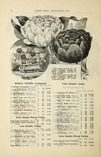 | Keywords: Bulbs and plants (16200955870).jpg CURRIE BROS MILWAUKEE WIS <br> One bulb each of the 40 <br> named Single Tulips by <br> mail postpaid SI 25; 3 <br> each S3 50 <br> One bulb each of the 18 <br> named Double Tulips by <br> mail postpaid 60 cents; <br> 3 each 1 50 <br> <br> SINGLE TULIPS Continued <br> Each Doz Per 100 <br> b 9 Prince of Austria-Orange <br> shaded scarlet very fine 5 45 3 00 <br> b 6 Rachel Ruisch Rosy pink <br> fine 4 35 2 25 <br> a 7 Rembrandt Crimson 4 35 2 00 <br> c 7 R oi P e p i n Crimson and <br> white 7 70 5 50 <br> c 6 Rose Gris de Lin Very <br> finerose 4 40 2 75 <br> c 7 Rosa Mundi Bright Rose 4 35 2 50 <br> d 7 Standard Royal Silver <br> white and crimson 5 45 3 00 <br> c 12 Thos Moore Orange 4 40 2 50 <br> b7Van der Neer The finest <br> of all violets 4 35 2 00 <br> b 7 Vermillion Brilliant-Fine <br> red 5 45 3 50 <br> c 7 Yellow Prince Fine yel- <br> low sweet scented 4 35 2 50 <br> Early Single Mixed Tulips <br> Doz 100 1000 <br> Fine Early Varieties Mixed 20 85 7 50 <br> Extra Fine Early Varieties <br> Mixed 25 100 8 50 <br> Late Double Tulips <br> Each Doz 100 <br> e 17 Blue Flag Violet blue 4 35 2 00 <br> f 12 Labelle Alliance- Over <br> winner' Blue and white <br> feathered 4 35 2 00 <br> g 16 Manage de Ma Fill e <br> White feathered cherrv <br> crimson 5 50 4 00 <br> g 10 Yellow Rose - Splendid <br> golden vellow verv large <br> flower 4 35 2 00 <br> Fine Mixed All colors 3 25 1 25 <br> Early Double Tulips <br> If by mail add 40c per 100 <br> Each <br> -Fin- <br> Doz Per 100 <br> Orange <br> -Red and <br> c 9 Couronne de Roses- <br> est rose <br> MO Couronne d'Or- <br> b 6 Due Van Tholl <br> vellow 3 <br> c Duke of York Red and <br> white 3 <br> c 9 Gloria Solus Brown and <br> vellow 3 <br> b S Imperator Rubrorum <br> Very fine scarlet 4 <br> c 8 La Candeur Pure white <br> finest 3 <br> c 6 La Blazon Fine rose 4 <br> c n Murilo Light rose 5 <br> e'»Paeony R o s e Scarlet <br> feathered vellow 3 <br> e 9 Paeony Gold Scarlet 3 <br> b 9 Purple Crown Bronze red 3 <br> c 8 Rex Rubrorum Fine scar- <br> let 4 <br> c 8 Rosine Light rose 4 <br> b 7 Salvator Rose Fine rose 5 <br> d 8 Titian Brown and yellow 3 <br> e 9 Tournesoll Bright red and <br> vellow 4 <br> b 8 Tournesoll Yellow 6 <br> 75 <br> 65 <br> 30 <br> 30 <br> 40 <br> 5 00 <br> 4 50 <br> 1 25 <br> 200 <br> 200 <br> 2 75 <br> 30 1 50 <br> 40 2 75 <br> 45 3 50 <br> 30 <br> 30 <br> 30 <br> 40 <br> 40 <br> 50 <br> 25 <br> 40 <br> 60 <br> 200 <br> 200 <br> 2 25 <br> 2 75 <br> 2 50 <br> 400 <br> 1 75 <br> 2 75 <br> 4 50 <br> Early Double Mixed Tulips <br> Doz 100 1000 <br> Fine Mixed Early Varieties <br> Mixed <br> Extra Fine Early Varieties- <br> Mixed 25 1 00 <br> 20 90 8 00 <br> 900 42214136 133055 65937 Page 6 Text http //www biodiversitylibrary org/page/42214136 1908 10 5962/bhl title 65937 Currie Brothers Company ; Henry G Gilbert Nursery and Seed Trade Catalog Collection NameFound Rubrorum NameFound Salvator NameConfirmed Salvator NameBankID 212455 NameFound Solus NameConfirmed Solus EOLID 13932317 NameBankID 2991169 Biodiversity Heritage Library Currie Bros Co Bulbs and plants autumn 1901 Garden Stories Bulbs Plants Catalogs Flowers Nurseries Horticulture Plants Ornamental Seeds U S Department of Agriculture National Agricultural Library bhl page 42214136 dc identifier http //biodiversitylibrary org/page/42214136 bhlGardenStories BHLinbloom bulbs plants nurseries horticulture plants ornamental u s department of agriculture national agricultural library bhlgardenstories bhlinbloom Information field Flickr posted date ISOdate 2015-01-28 Check categories 2015 August 24 CC-BY-2 0 BioDivLibrary https //flickr com/photos/61021753 N02/16200955870 2015-08-24 07 54 41 cc-by-2 0 PD-old-70-1923 Currie Bros catalogs Photos uploaded from Flickr by Fæ using a script |