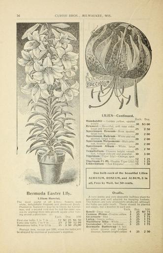Keywords: Bulbs and plants (16202154229).jpg CURRIE BROS MILWAUKEE WIS <br> LILIES ” Continued <br> Humboldtii ”Golden yellow spotted <br> Purple _ 30 <br> Krameri ” Beautiful soft rose color <br> large and fragrant 25 <br> Speciosum Roseum ” Rose spotted <br> large bulbs 20 <br> Speciosum Rubrum ” White and red <br> spotted large bulbs 20 <br> Speciosum Melpomene ” Rich crim- <br> son heavily spotted 20 <br> Speciosum Album ” White large <br> bulbs 25 <br> Tenuifolium ” Flowers bright vermil- <br> lion foliage delicate and graceful 30 <br> Tigrinum Tiger Lily ” Orange spot- <br> ted black 12 <br> Tigrinum Fl Pi Double Tiger Lily 12 <br> Umbellatum ” See Elegans 15 <br> Doz <br> 3 00 <br> 2 50 <br> 2 00 <br> 2 00 <br> 2 00 <br> 2 50 <br> 3 00 <br> 1 25 <br> 1 25 <br> 1 50 <br> Bermuda Easter Lily <br> Liiium Harrisi <br> The most useful of all Lilies; flowers pure <br> white delightfully fragrant and produced freely <br> Planted in September may be in bloom for Christ- <br> mas and a second crop may be had the same sea- <br> son by starting them into growth again after hav- <br> ing rested a short time ” <br> Each Doz 100 <br> First size bulbs 5 to 7 in 12 1 25 6 50 <br> Extra size bulbs 7 to 9 in 25 2 50 12 00 <br> Monstrous bulbs 9 to 12 in 35 3 50 25 00 <br> Postage free except per 100 when the bulbsj»viil <br> be shipped by express or purchaser's expense <br> One bulb each of the beautiful Lilies <br> AURATUM ROSEUM and ALBUM 3 in <br> all Free by Mail for 50 cents <br> Oxalis <br> A very pretty and very desirable bulbous plant for <br> pot-culture and well adapted for hanging baskets <br> The flowers are very abundantly produced although <br> the bulbs are quite small These should be planted <br> not singly but a number in each pot <br> Each Doz 100 <br> Bowii ” Deep rose 3 25 1 75 <br> Cernua Plena ” Double yellow 4 35 2 50 <br> Incarnato ” Red 3 25 1 75 <br> Lutea ” Single yellow 3 25 175 <br> Multiflora Alba-White 3 25 1 75 <br> Versicolor ” White bordered 3 25 1 75 <br> Bermuda Buttercup ” A lux- <br> uriant grower and profuse <br> bloomer flowers bright yellow 4 35 2 50 42214146 133055 65937 Page 16 Text http //www biodiversitylibrary org/page/42214146 1908 10 5962/bhl title 65937 Currie Brothers Company ; Henry G Gilbert Nursery and Seed Trade Catalog Collection NameFound Cernua NameConfirmed Cernua EOLID 4578743 NameBankID 176392 NameFound Elegans NameConfirmed Elegans NameBankID 5116399 NameFound Liiium NameFound Multiflora NameConfirmed Multiflora Small J M MacDougal Feuillet supersect NameBankID 9260529 NameFound Oxalis NameConfirmed Oxalis sect Pseudobulbosae Norlind EOLID 40270 NameFound Rubrum NameFound Speciosum NameFound Tenuifolium NameFound Tigrinum NameFound Umbellatum Biodiversity Heritage Library Currie Bros Co Bulbs and plants autumn 1901 Garden Stories Bulbs Plants Catalogs Flowers Nurseries Horticulture Plants Ornamental Seeds U S Department of Agriculture National Agricultural Library bhl page 42214146 dc identifier http //biodiversitylibrary org/page/42214146 bhlGardenStories BHLinbloom bulbs plants nurseries horticulture plants ornamental u s department of agriculture national agricultural library bhlgardenstories bhlinbloom Information field Flickr posted date ISOdate 2015-01-28 Check categories 2015 August 24 CC-BY-2 0 BioDivLibrary https //flickr com/photos/61021753 N02/16202154229 2015-08-24 07 56 18 cc-by-2 0 PD-old-70-1923 Currie Bros catalogs Photos uploaded from Flickr by Fæ using a script |