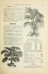 | Keywords: Bulbs and plants (16362407776).jpg  s of which we <br> cheerfully furnish on application We here enum- <br> erate a few of the most popular <br> Areca Lutescens  Slender plume-like leaves a <br> very handsome excellent house plant Price each <br> 50c <br> Cocos Weddeliana-A charming plant unquest- <br> ionably the most graceful of all the small Palms; ex- <br> tensively used as table ornaments Price each 25c <br> to 50c <br> Kentia Belmoreana  Resembles Areca but is <br> hardier and more robust in habit of growth; the <br> leaves are strong yet very graceful and are a rich <br> dark green; a splendid house plant and in great de- <br> mand Price each small plants 25c <br> Kentia Fosteriana  A beautiful species with <br> bright green foliage; broader and heavier than that <br> of the foregoing Price each small plants 25c <br> CHINESE FAN PALM <br> KENTIA BELMOREANA <br> Prices of larger Kentias <br> Height Belmoreana Fosteriana <br> 10 inches each 50 35 <br> 12 inches each 75 50 <br> 12 to 15 inches each 1 00 75 <br> 15 to 18 inches each 1 25 1 00 <br> 18 to 20 inches each 1 50 1 25 <br> 20 to 22 inches each 2 00 150 <br> 22 to 24 inches each 2 50 2 00 <br> 24 to 28 inches each 3 00 2 50 <br> 28 to 32 inches each 4 00 3 00 <br> 32 to 36 inches each 5 00 3 50 <br> Latania Borbonica Chinese Fan Palm  A <br> great favorite perhaps the most desirable of all the <br> Palms for general cultivation Leaves broadly fan - <br> shaped <br> Small plants Price each 25 <br> 12 inches high Price each 50 <br> 15 inches high Price each 1 00 <br> 18 inches high Price each 1 50 <br> 30 inches high Price each 5 00 <br> Phoenix Reclinafa  An excellent Palm; stands <br> much abuse therefore very useful for decoration <br> 10 inches high Price each 50 <br> 12 inches high Price each 75 <br> 15 inches high Price each 1 00 <br> 18 inches high Price each 1 50 <br> 20 inches high Price each 2 00 <br> Smilax <br> Myrsiphyllum Aspai agoiJes <br> This charming vine is now considered quite indis- <br> pensable in all tloral decorations It is verv easil\ <br> grown Price leach 15c 42214151 133055 65937 Page 21 Text http //www biodiversitylibrary org/page/42214151 1908 10 5962/bhl title 65937 Currie Brothers Company ; Henry G Gilbert Nursery and Seed Trade Catalog Collection NameFound Areca NameConfirmed Areca EOLID 29328 NameBankID 2665610 NameFound Kentia belmoreana NameConfirmed Kentia belmoreana C Moore F Muell EOLID 1142854 NameBankID 8371204 NameFound Latania NameConfirmed Latania EOLID 35120 NameBankID 1850318 NameFound Myrsiphyllum NameConfirmed Myrsiphyllum EOLID 5890390 NameBankID 3411724 NameFound Pandanus NameConfirmed Pandanus subsect Retusiflora Huynh EOLID 31710 NameFound Smilax NameConfirmed Smilax Jorge08 EOLID 3396175 Biodiversity Heritage Library Currie Bros Co Bulbs and plants autumn 1901 Garden Stories Bulbs Plants Catalogs Flowers Nurseries Horticulture Plants Ornamental Seeds U S Department of Agriculture National Agricultural Library bhl page 42214151 dc identifier http //biodiversitylibrary org/page/42214151 bhlGardenStories BHLinbloom bulbs plants nurseries horticulture plants ornamental u s department of agriculture national agricultural library bhlgardenstories bhlinbloom Information field Flickr posted date ISOdate 2015-01-28 Check categories 2015 August 24 CC-BY-2 0 BioDivLibrary https //flickr com/photos/61021753 N02/16362407776 2015-08-24 07 55 11 cc-by-2 0 PD-old-70-1923 Currie Bros catalogs Photos uploaded from Flickr by FĂŚ using a script |
