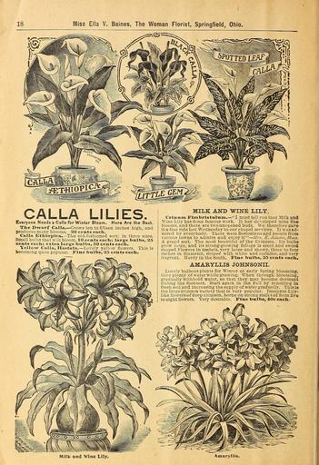 Keywords: Bulbs, roses, plants of all kinds for winter blooming (16582177242).jpg 18 <br> Miss Ella V Baines The Woman Florist Springfield Ohio <br> CALLA LILIES <br> Everyone Needs a Calla for Winter Bloom Here Are the Best <br> The Dwarf Calla Grows ten to fifteen inches high and <br> produces many blooms 20 cents each <br> Calla Ethioplca -The old-fashioned sort; in three sizes <br> Small bulbs that will bloom 10 cents each; large bulbs 25 <br> cents each; extra large bulbs 50 cents each <br> \'ellow Calla Hastata Lovely yellow flowers This is <br> becoming quite popular Fine bulbs 25 cents each <br> MILK AND WINE LILY <br> Crlnum Fimbrlatulum I must tell you that Milk and <br> Wine Lily has done famous work It has developed nine fine <br> blooms and there are two unopened buds We therefore gave <br> it a free ride last Wednesday to our chapel services It was ad- <br> mired by everybody There were Bostonians and people from <br> various towns to admire and enjoy if Mrs E Adams Mass <br> A grand sort The most beautiful of the Crinums Its bulbs <br> grow large and its strong-growing foliage is erect and sword <br> shaped Flowers in umbels very large and showy three to four <br> inches in diameter striped with white and carmine and very <br> fragrant Hardy in the South Fine bulbs 35 cents each' <br> AMARYLLIS JOHNSONII <br> Lovely bulbous plants for Winter or early Spring blooming <br> Give plenty of water while growing When through blooming <br> gradually withhold water so that they may become dormant <br> during the Summer Start again in the Fall by repottirg in <br> fresh soil and increasing the supply of water gradually Thisis <br> the large crimson variety that is very popular Immense Lily- <br> like flowers of deep crimson borne on strong stalks of from five <br> to eight flowers Very desirable Fine bulbs 40c each- <br> Milk and Wine Lily <br> \maryllis 41846865 130959 64576 Page 18 Text http //www biodiversitylibrary org/page/41846865 1901 10 5962/bhl title 64576 Ella V Baines Firm ; Henry G Gilbert Nursery and Seed Trade Catalog Collection NameFound Amaryllis johnsonii NameConfirmed Amaryllis johnsonii NameBankID 10495504 Biodiversity Heritage Library Bulbs roses plants of all kinds for winter blooming 1901 Garden Stories Bulbs Plants Catalogs Flowers Plants Ornamental Seed industry and trade Seeds Trade catalogs U S Department of Agriculture National Agricultural Library bhl page 41846865 dc identifier http //biodiversitylibrary org/page/41846865 bhlGardenStories Miss Ella V Baines Lilies BHLinbloom bulbs plants plants ornamental u s department of agriculture national agricultural library bhlgardenstories miss ella v baines bhlinbloom Information field Flickr posted date ISOdate 2015-02-19 CC-BY-2 0 BioDivLibrary https //flickr com/photos/61021753 N02/16582177242 2015-08-24 02 51 15 cc-by-2 0 PD-old-70-1923 Bulbs roses plants of all kinds for winter blooming Photos uploaded from Flickr by FĂŚ using a script |