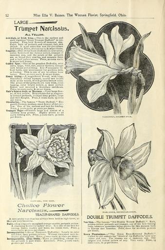 | Keywords: Bulbs roses plants of all kinds for winter blooming (16394065791).jpg 12 <br> Miss Ella V Baines The Woman Florist Springfield Ohio <br> LARGE- <br> Trumpet Nafcisslis <br> All Yellow <br> Ard-Kizh or Irish King This is the earliest and <br> most vigorous Giant Trumpet Daffodil in cul- <br> tivation Fine bold flowers of immense size <br> Color both of perianth and trumpet full rich <br> yellow It is an extra fine sort for pot culture <br> and forcing Price locents each; 1 00 per dozen <br> Emperor One of the finest Daffodils in cultivation <br> entire flowers of the richest yellow trumpet of <br> immense size and the petals of the perianth <br> are so broad they overlap and measure three <br> and a half inches across Price 20 cents each; <br> 1 00 per half dozen <br> Golden Spur One of the grandest Daffodils with <br> extra large bold rich yellow flowers; foliage <br> very broad and striking It is oT unusually ro- <br> bust habit and unsurpassed for gardens pots <br> or forcing This is one of my favorites; none <br> better Price io cents each; i oo per dozen <br> Henry Irving A magnificent flower with long <br> beautifully frilled trumpet nearly two inches <br> wide at the mouth of rich golden-yellow color <br> The petals of the perianth are very wide over- <br> lapping color bright yellow a most perfect <br> flower and received a first-class certificate <br> Price io cents each; i oo per dozen <br> Hale's Beaten Gold or Maximus Very large flow- <br> er of rich yellow Remarkable for an elegant- <br> ly twisted perianth trumpet deep golden large <br> and -well flanged Price S cents each; 75 cents <br> per dozen <br> Obvallarins The famous Tenby Daffodil Ele- <br> gantly formed medium-sized flower of rich yel- <br> low One of the earliest and best for forcing <br> Price 5 cents each; 50 cents per dozen <br> Trumpet Major Flowers large and almost of a <br> uniform deep golden Highly prized as an <br> early forcing sort Price 5 cents each; 50 cents <br> per dozen <br> NARCISSUS GOLDEN SPUR <br> DAFFODIL VON SION <br> Chalice Flower <br> Narcissus <br> TEACUP'SHAPED DAFFODILS <br> A very pretty tvpe that has always been held in high favor as <br> they are very beautiful <br> Fairy Cup elegantly margined orange-scarlet perianth yellow <br> A charming flower for ladies' wear It is one of the best for <br> cutting forces readily and holds the bloom well Price 5 <br> cents each; 50 cents per dozen <br> InCOmparabilis Great Nonesuch Daffodils Lovely in color <br> and form deep golden-yellow Without exception very de- <br> sirable and fragrant Price 5 cents each; 50 cents per dozen <br> Incomparabilis Albns Stella Same as preceding except th;ic <br> the perianth is pure white Excellent Price 5 cents each; <br> 50 cents per dozen <br> NARCISSUS INCOMPARABILIS <br> DOUBLE TRUMPET DAFFODILS <br> Von Sion The famous Old Double Yellow DafFodil Rich <br> golden-3'ellow perianth and trumpet one of the best forcing- <br> sorts immense quantities being grown for this purpose both <br> in Europe and America Price three for 10 cents; 30 cents <br> per dozen <br> Rosea Plenissimns The Great Rose-flowered Daffodil <br> Called bv old authors the Glory of the Daffodils now very <br> carce and rare The blooms are of immense size The <br> largest and richest yellow of any Very early Price 15 <br> cents each; 1 50 per dozen 41881520 131173 64737 Page 12 Text http //www biodiversitylibrary org/page/41881520 1897 10 5962/bhl title 64737 Ella V Baines Firm ; Henry G Gilbert Nursery and Seed Trade Catalog Collection NameFound Sion NameConfirmed Sion NameBankID 4854187 Biodiversity Heritage Library Bulbs roses plants of all kinds for winter blooming all the very best and choicest varieties 1897 Garden Stories Bulbs Plants Catalogs Flowers Plants Ornamental Seed industry and trade Seeds Trade catalogs U S Department of Agriculture National Agricultural Library bhl page 41881520 dc identifier http //biodiversitylibrary org/page/41881520 bhlGardenStories BHLinbloom bulbs plants plants ornamental u s department of agriculture national agricultural library bhlgardenstories bhlinbloom Information field Flickr posted date ISOdate 2015-01-29 CC-BY-2 0 BioDivLibrary https //flickr com/photos/61021753 N02/16394065791 2015-08-24 06 50 45 cc-by-2 0 PD-old-70-1923 Bulbs roses plants of all kinds for winter blooming Photos uploaded from Flickr by Fæ using a script |