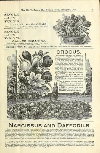 MAKE A MEME View Large Image Bulbs roses plants of all kinds for winter blooming (16208176988).jpg Miss Ella V Baines The Woman Florist Springfield Ohio <br> 11 <br> BYBLOOMS <br> SINGJLB <br> LJLTB <br> TULIPS <br> CALLED <br> White grounds variegated with various ...