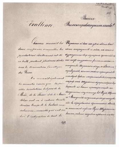 Keywords: Bulgarian Macedonian Memorandum to the Great Powers 1878 01.jpg Апел на македонските бълга и към Великите сили за п исъединяване към Бълга ия Ст аница 1 Текст в о игинал Ваше Высокоп евозходителство Познаты с Unicode ѫ вече на ц лъ св ть веков- ныте ст аданiя и м ѫ кы на които беззащитно б ха изложены х истiяны- те подъ ту ското фанатическо го- сподство Познато е с ѫ що че адскыте изтязанiя които особено п ет ьп въ посл дн в ме ми олюбивiя блъга скiй на одъ отъ ту ското безп им но ва - ва ство по всето п ост анство на бащиното му огнище въ iзiя Т акiя и акедонiя подигнаха общо негодова- нiе въ об азованый ев опейскый св тъ и найпосл извика Руско-Ту ската война която недавно п стана по Memorandum of the Macedonian Bulgarian Municipalities to the Great Powers for unification with Bulgaria Page 1 Scanned from History of Bulgaria Bulgarian Academy of Sciences Исто ия на Бълга ия Том 7 Бълга ия 1878 - 1903 Издателство на БА София 1991 ст 400 1878-05-20 Bulgarian Municipalities in Macedonia File Bulgarian Macedonian Memorandum to the Great Powers 1878 02 jpg File Bulgarian Macedonian Memorandum to the Great Powers 1878 03 jpg File Bulgarian Macedonian Memorandum to the Great Powers 1878 04 jpg PD-old Historical documents of Bulgaria History of the Republic of Macedonia Congress of Berlin |