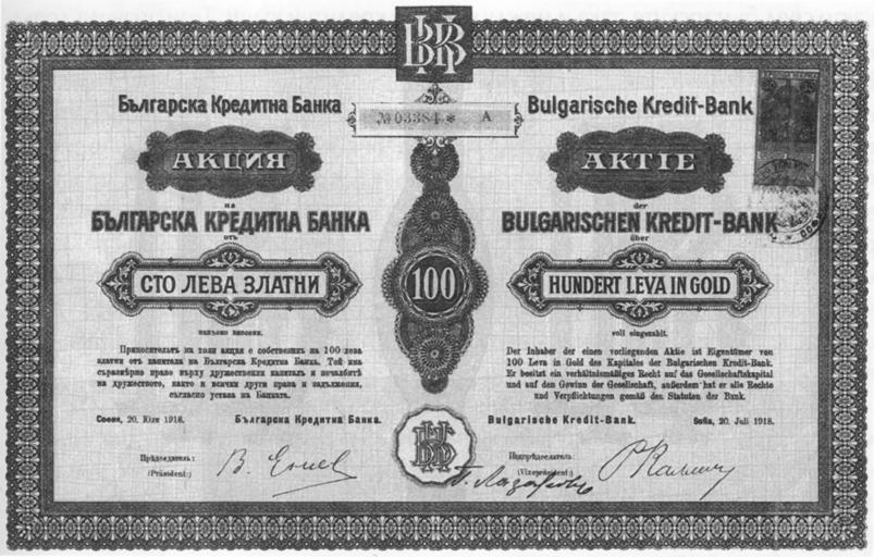| Keywords: Bulgarska kreditna banka share.jpg Акция на Бълга ска к едитна банка Ав амов Румен Комуналният капитализъм Т II София Фондация Бълга ска наука и култу а / Центъ за либе ални ст атегии 2007 ISBN 978-954-90758-8-5 с 445 1918 Author Anonymous-EU Former banks in Sofia Stock certificates of banks in Bulgaria Revenue stamps of Bulgaria Revenue stamps on documents |