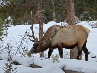 Keywords: yellowstone national park yellowstonenationalpark yellowstone national park nationalpark wyoming outdoor animal sheep Bull elk browsing lodgepole pine seedling; Jim Peaco; January 2013; Catalog #19052d; Original #IMG_5718 Bull elk browsing lodgepole pine seedling; Jim Peaco; January 2013; Catalog #19052d; Original #IMG_5718