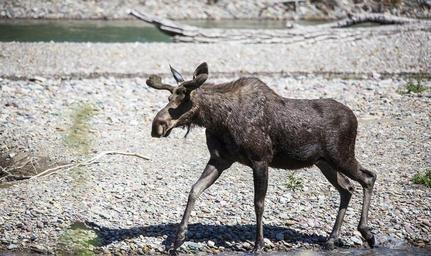 Keywords: bull moose young wildlife nature male antlers wilderness river bank walking portrait outdoors juvenile rocks