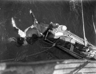 | Keywords: inisheer inis oírr inisoírr aran islands aranislands transport dún aengus dúnaengus steamer currachs oars chains ropes aran islanders aranislanders bullock cattle horns sea may 1939 1930s islands galway ireland independent newspapers collection independentnewspaperscollection national library of ireland nationallibraryofireland blackandwhite monochrome surreal outdoor black and white Follow on from Bullock No. I. This shot was taken looking down from the steamer Dún Aengus as the bullock's "swim" was almost finished. Inisheer islanders bringing a bullock out to the Dublin built steamer, the Dún Aengus, on 31 May 1939 for transport to Galway. This is how livestock had to be transported from the island between 1921 and 1958 until a pier was built on Inisheer (Inis Oírr) in 1997. Date: 31 May 1939 NLI Ref.: INDH3343 Follow on from Bullock No. I. This shot was taken looking down from the steamer Dún Aengus as the bullock's "swim" was almost finished. Inisheer islanders bringing a bullock out to the Dublin built steamer, the Dún Aengus, on 31 May 1939 for transport to Galway. This is how livestock had to be transported from the island between 1921 and 1958 until a pier was built on Inisheer (Inis Oírr) in 1997. Date: 31 May 1939 NLI Ref.: INDH3343 |