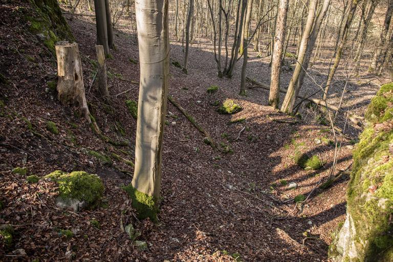 Keywords: Burgstall Großes Haus 31.jpg de Burgstall Großes Haus - Wallgraben zwischen dem Burgfelsen links und einem benachbarten Felsklotz 2015-03-20 14 19 28 own Sven-121 other versions 49 947714 11 338699 cc-zero Burgstall Großes Haus Uploaded with UploadWizard
