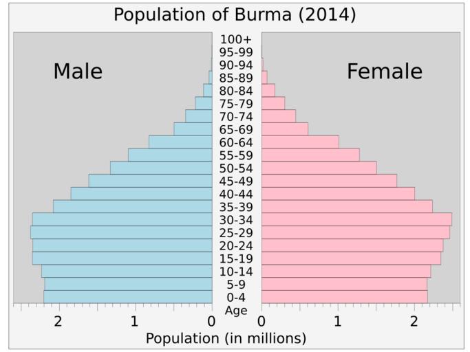 | Keywords: Burmapop.svg translate yes en Current population pyramid of Burma 2014 from UN estimates World Population Prospects http //esa un org/unpd/wpp/Excel-Data/population htm The 2012 Revision 2014-08-19 own Delphi234 cc-zero Uploaded with UploadWizard Population pyramids of Myanmar |