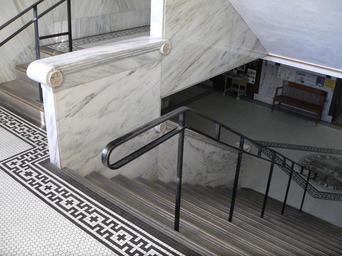 Keywords: Burt County Courthouse interior stairs.JPG Burt County Courthouse in Tekamah Nebraska The photo was taken from the landing between the ground and second floors The mosaic at the base of the stairs at right is the circular Nebraska state seal set inside a lozenge The Beaux-Arts building was constructed in 1916 It is listed in the National Register of Historic Places own Ammodramus 2010-10-29 Pictures by Ammodramus Taken with Panasonic Lumix DMC-FZ20 Burt County Courthouse Stairs in Nebraska |