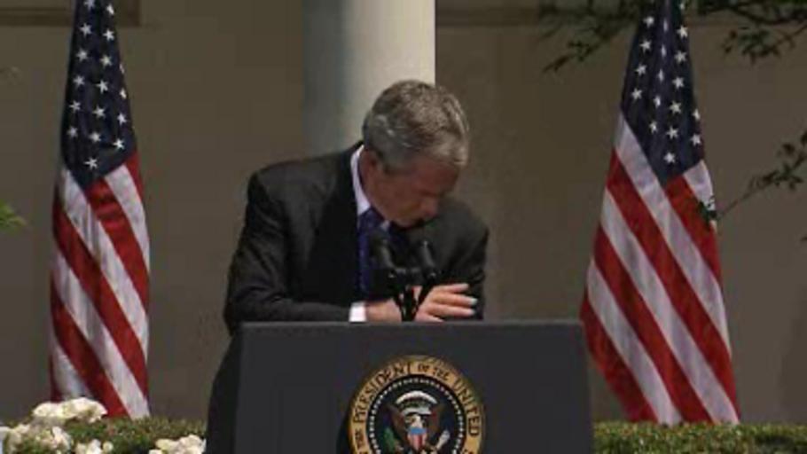 | Keywords: Bush Bird poop 3.png Image Screen shot Image 3 of 4 of United States President George W Bush wipes off bird feces with his bare hand during a press conference on May 24 2007 in the White House Rose Garden Bush was addressing the American press in the White House's Rose Garden The incident occurred just as Bush said I've got confidence in Al Gonzales doin' the job referring to a question asked by a reporter about the controversial dismissal of several U S attorneys Source http //www whitehouse gov/news/releases/2007/05/20070524 html <br /> Direct link to video http //mfile akamai com/5913/wmv/whitehouse download akamai com/5913/2007/05/20070524 v asx obj 2 must download/open link into a player such as VideoLAN PD-USGov George W Bush in 2007 20070524 West Colonnade White House W |