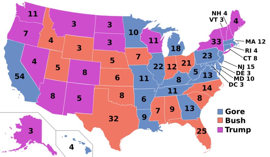| Keywords: Bush vs. Gore vs. Trump.svg en Hypothetical 2000 U S Presidential election map pitting George W Bush against Al Gore and Donald Trump File ElectoralCollege2000 svg MB298 2016-12-05 SVG maps by MB298 Fictitious U S presidential election maps |