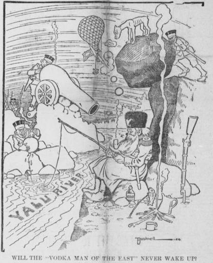 Keywords: Bushnell cartoon about Russian somnolence in the face of Japanese aggression.jpg Russian Empire sits placidly by the Yalu River clutching his fishing rod and smoking a pipe; by his side is a bottle of vodka Multiple Imperial Japan Japanese soldiers prepare to launch attacks on him <p>The caption asks WILL THE 'VODKA MAN OF THE EAST' NEVER WAKE UP 1904-04-27 http //chroniclingamerica loc gov/lccn/sn88085187/1904-04-27/ed-1/seq-1/ The Tacoma Times Creator E A Bushnell other versions PD-old-70-1923 Uploaded with UploadWizard Cartoons by E A Bushnell Images from The Tacoma Times |