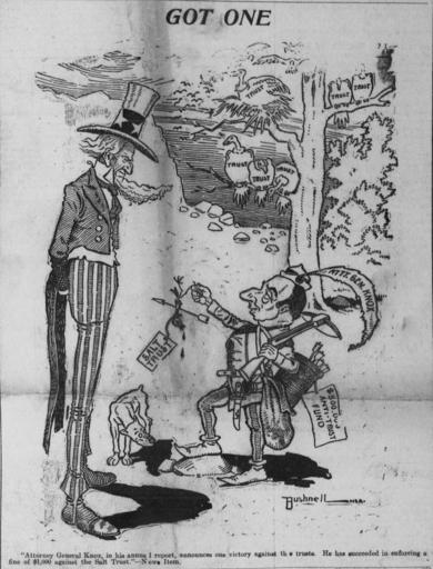 Keywords: Bushnell cartoon on Knox vs Salt.jpg Philander Knox shows Uncle Sam the results of his hunting for trust business trusts he has slain the Salt Trust and forced it to pay a fine of 1000 in 1904 dollars Meanwhile much larger trusts sit unperturbed 1904-01-26 http //chroniclingamerica loc gov/lccn/sn88085187/1904-01-26/ed-1/seq-1/ The Tacoma Times Creator E A Bushnell other versions PD-old-70-1923 Uploaded with UploadWizard Cartoons by E A Bushnell Philander C Knox Images from The Tacoma Times 1904 cartoons Uncle Sam |