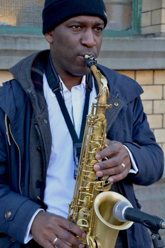 Keywords: busking african american money african black busk male music musical musician outdoors panhandling perform performance performer person playing play saxophone