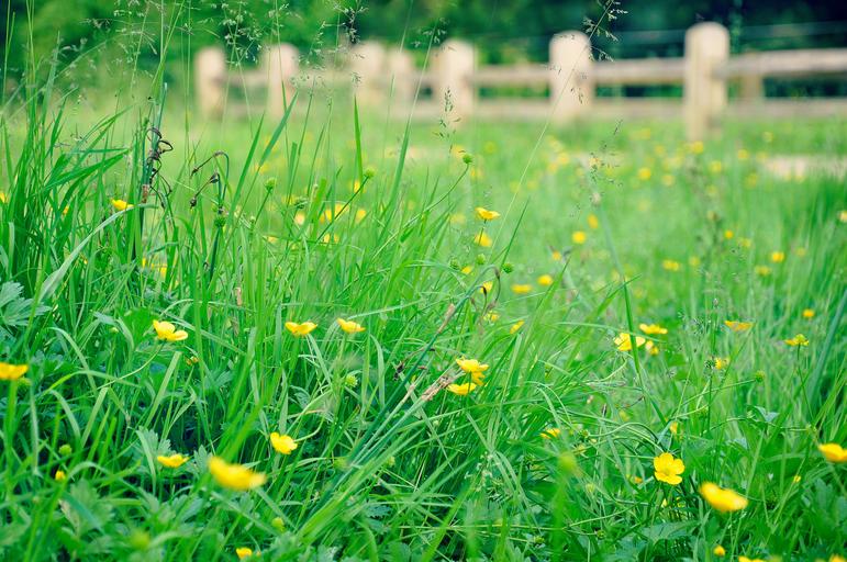 Keywords: buttercup flower meadow meadow flowers grassland grass green field rural fence summer