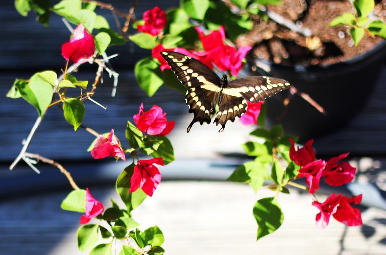 Keywords: butterfly backyard bougainvillea pink flowers plant nature