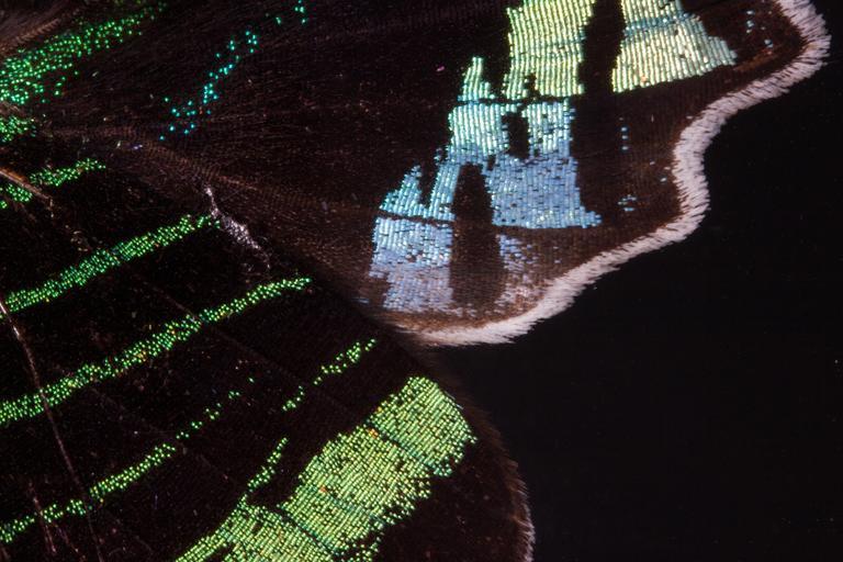 Keywords: butterfly exotic south america amazon iridescent scale wing scales turquoise blue violet green insect wing color brown white macro structure background fund
