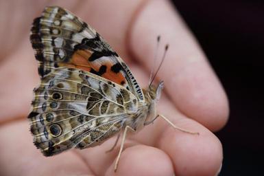 Keywords: butterfly painted lady close blossom bloom edelfalter insect summer animal fauna butterflies flower wing child's hand hand protect protection environmental protection child keep leave blank careful carefully freedom responsibility