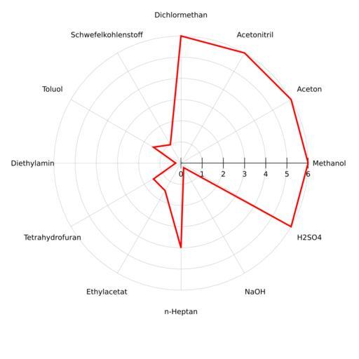 | Keywords: Butylkautschuk-Spinne.svg Spinnendiagramm Beständigkeit von Butylkautschuk-Schutzhandschuhen Own after http //www dguv de/dguv/medien/ifa/de/pra/chemikalienschutzhandschuhe/pdf/butylkautschuk pdf 2015-01-12 Kopiersperre <span class signature-talk ></span> PD-own v reset set term svg size 700 700 fname 'Verdana' fsize 14 set size square 9 set lmargin at screen 15 set tmargin at screen 9 set angles degrees unset key unset border set polar set rtics 0 1 unset xtics unset ytics set grid polar 30 lt 1 lc 0 lw 0 3 set_label x text sprintf set label ' s' at 7 cos f 7 sin f center text x x eval set_label 0 Methanol 6 eval set_label 30 Aceton 6 eval set_label 60 Acetonitril 6 eval set_label 90 Dichlormethan 1 eval set_label 120 Schwefelkohlenstoff 1 5 eval set_label 150 Toluol 0 eval set_label 180 Diethylamin 1 5 eval set_label 210 Tetrahydrofuran 1 5 eval set_label 240 Ethylacetat 4 eval set_label 270 n-Heptan 4 eval set_label 300 NaOH 6 eval set_label 330 H2SO4 6 set output 'butyl svg' plot - u 1 2 t Butylkautschuk w l lt 1 lw 3 lc rgb 0xFF0000 0 6 30 6 60 6 90 6 120 1 150 1 5 180 0 25 210 1 5 240 1 5 270 4 300 0 25 330 6 360 6 e unset output |