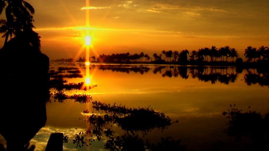 Keywords: BW 15.JPG en Sunrise from a houseboat in Allappuzha Kerala India Own Anjalichandhok 2008-10-04 Canals of the Kerala backwaters Geography of Alappuzha Sunrises of Kerala