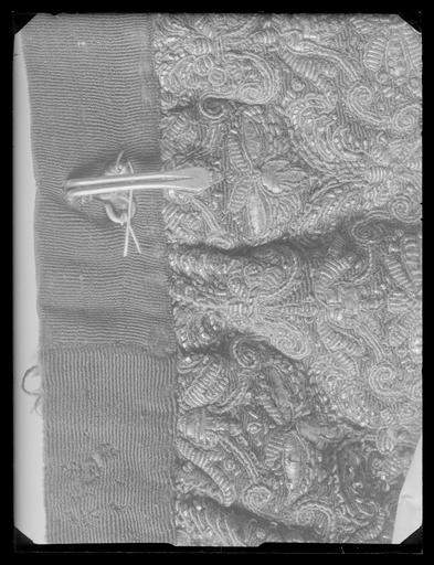 | Keywords: Byxor av guldlamé helt täckt av guldbroderi - Livrustkammaren - 2581.tif LSH artwork sv Dräkten beställdes 1654 från Frankrike genom Magnus Gabriel de la Gardie inför festligheterna vid Karl X Gustavs kröning och efterförljande bröllop Byxor av rak modell De är sydda av 4 egentliga huvudbeståndsdelar som dock försetts med skarvar av något varierande storlek nertill horisontellt för att öka längden samt vertikala ökningstycken framtill vid sprundet och på motsvarande ställen baktill och slutligen nertill vid byxbenens inre sömmar Ursprungsmaterialet är gul filemort oskuren sammet men skarvstyckena är något mörkare med dragning åt rött i färgen Ursprungsmaterialets vådbredd är minst 43 cm 14 rader oskurna öglor på rätan Byxorna har raka sömmar i sidorna och svagt sneddade fram och baksömmar Framtill är ett 34 cm långt sprund När sprundens längd angives i texten inbegripes aldrig linningen med en c a 29 cm lång knäppslå med 12 knapphål knäppslån följer i hela sin längd det iskarvade mörkare stycket framtill Byxorna är något rynkade vid den 127 5 cm långa linningen som också försetts med flera skarvar baktill I denna finns de 2 stora 2 1 cm i diam guldtrådsklädda knapparna kvar De knäpps med de 4 cm långa knapphålen på vänster framsida I linningen finns 7 st silverhakar kvar den främsta på vänster sida som skulle träs genom det lilla tränsade hålet vid urfickan saknas Linningen är gjord av något grövre oskuren sammet Linningsknapparna är av samma typ som den som finns kvar i byxorna till dräkt nr 3418 De 2 stora byxfickorna har 22 5 cm långa vertikala sprund i sidsömmarna Ficksäckarna är av skinn På höger framstycke finns också en mindre ficka med vertikalt sprund 19 cm från framkanten räknat Dessa 3 fickor har stoffering med gul moiré samma sort som också begagnats i fickan på byxlinningen till dräkt nr 3418 Knapphålsslån är på rätan gjord av guldbrokad av samma sort som tröjans foder och av relativt mörk sammet på baksidan De 2 cm långa knapphålen är sydda med 8 stygn/cm av gult högertvinnat silke Ficksprunden och knäppslån samt sprunden vid framkanterna är skodda med kastanjebrunt ripsband 14 inslagstr/cm Mellanfoder finns ej i byxorna men de har innerfoder av ursprungligen vit linnelärft 28x28 tr/cm2 Nedtill kan man i fodret se hål efter stygn ca 3 5 cm från kanten som tyda på att en slå eller skoning varit sydd på insidan Byxorna har garnerats med spets knypplad av guldtråd och med inlagda guldlan - samma typ som på tröjan Analysresultat Metalltråd av förgyllt silver legerat med koppar huvudbeståndsdelar Silver xxxGuld xxKoppar xxxZink 0Numera finns det spets kvar blott nedtill vid benen ca 1 8 cm bred Den är knypplad av ljusgul silkeskärna med högertvinnad guldlan samt 2 bandformiga lan varav en ligger intill spetsens stadkant och en i vinkelböjning lanen är 2 mm bred Förutom av spetsen nertill garneras byxorna av rosetter framtill av vilka de ursprungliga 5 alltjämt finns kvar på varje sida 3 i en övre horisontell rad och 2 därunder Rosetterna består dels av ett 2 5 cm brett metalltrådsband med 2 atlasränder av rött silke ca 18 inslagstr/cm som knutits i 3 öglor varje ögla 16 á 17 cm lång samt dels ett 4 2 cm brett metalltrådsband med bl a mönstervävda ränder i brunt silke 17 inslagstr/cm som också knutits i 3 öglor c a 16 cm i varje ögla Analysresultat band huvudbeståndsdelar Silver xxxGuld 0Koppar xZink 0På byxornas bakstycken finns ett par vertikala uppklipp ca 15 cm långa som sytts ihop På vänster sida framtill i linningen är byxorna på insidan märkta med bläck N 39 i 1789-90 års inv och de är urbrända i jämnhöjd med knapphålsslån ett stycke in i fodret Beträffande broderiets karaktär kan nämnas att de mörkare partierna skarvats om till det ursprungliga plagget har broderats med visserligen samma mönster men mer utdraget glesare och spretigare och samtidigt svulstigare och man har tydligen inte vetat vilka mönsterdetaljer som är huvudsakliga och vilka som är underordnade Sålunda har palmbladskvistarna vanligen 4 kvistar åt resp håll på det ursprungliga broderiet men oftast blott 3 på de mörkare partierna Bladkvistarna har i de nyare - sekundära mörkare styckena blivit lika breda nedtill som upptill vilket också utgör en skillnad mot det ursprungliga broderiet Vidare är bågarna som hålla palmkvistarna mer svängda och har 7 jämnstora kulor över sig Man har dock i de tillskarvade partierna låtit mönstret fortsätta på det mest eleganta sätt Blott i sidsömmarna stämma mönstren numera ej överens men här har ju en spets dolt sömmen Det gamla broderiet verkar därtill gulare I byxornas nederkant fortsätter broderiet i det lilla upp- och invikta stycket Här har man alltså haft en ytterligare marginal att släppa på Broderiet har ej avpassats efter plaggets form med någon avslutande bård eller dylikt nedtill det är helt yttäckande och följer materialets riktning original caption Karl X Gustavs kröning 1654 linen Färg vit d2 - dräkt - foder material linnelärft - velvet Färg gul röd d1 - dräkt - yttermaterial material sammet size mm 127 5 midjemått LRK Karl X Gustav av Sverige Tre Karlar 1984-1985 Sweden - A Royal Treasury 1988-1989 Modelejon 2002 Les arts décoratifs sous Louis XIII 2002 Sweden and Europe 1632-1792 2003-2004 Fest och fritid vid hovet 2003 Livrustkammaren nya basutställning 2018 LRK bas 2018 Livrustkammaren place of origin original filename LN_E04576 67902 inventory number LRK 31309 2581 CC0 Byxor av guldlamé helt täckt av guldbroderi - Livrustkammaren - 2581-negative tif <gallery caption Different images of same object > File Byxor av guldlamé helt täckt av guldbroderi - Livrustkammaren - 11141 tif File Byxor av guldlamé helt täckt av guldbroderi - Livrustkammaren - 28265 tif File Byxor av guldlamé helt täckt av guldbroderi - Livrustkammaren - 45384 tif F