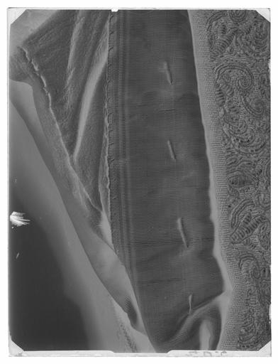 | Keywords: Byxor av guldlamé helt täckt av guldbroderi - Livrustkammaren - 11141-negative.tif LSH artwork sv Dräkten beställdes 1654 från Frankrike genom Magnus Gabriel de la Gardie inför festligheterna vid Karl X Gustavs kröning och efterförljande bröllop Byxor av rak modell De är sydda av 4 egentliga huvudbeståndsdelar som dock försetts med skarvar av något varierande storlek nertill horisontellt för att öka längden samt vertikala ökningstycken framtill vid sprundet och på motsvarande ställen baktill och slutligen nertill vid byxbenens inre sömmar Ursprungsmaterialet är gul filemort oskuren sammet men skarvstyckena är något mörkare med dragning åt rött i färgen Ursprungsmaterialets vådbredd är minst 43 cm 14 rader oskurna öglor på rätan Byxorna har raka sömmar i sidorna och svagt sneddade fram och baksömmar Framtill är ett 34 cm långt sprund När sprundens längd angives i texten inbegripes aldrig linningen med en c a 29 cm lång knäppslå med 12 knapphål knäppslån följer i hela sin längd det iskarvade mörkare stycket framtill Byxorna är något rynkade vid den 127 5 cm långa linningen som också försetts med flera skarvar baktill I denna finns de 2 stora 2 1 cm i diam guldtrådsklädda knapparna kvar De knäpps med de 4 cm långa knapphålen på vänster framsida I linningen finns 7 st silverhakar kvar den främsta på vänster sida som skulle träs genom det lilla tränsade hålet vid urfickan saknas Linningen är gjord av något grövre oskuren sammet Linningsknapparna är av samma typ som den som finns kvar i byxorna till dräkt nr 3418 De 2 stora byxfickorna har 22 5 cm långa vertikala sprund i sidsömmarna Ficksäckarna är av skinn På höger framstycke finns också en mindre ficka med vertikalt sprund 19 cm från framkanten räknat Dessa 3 fickor har stoffering med gul moiré samma sort som också begagnats i fickan på byxlinningen till dräkt nr 3418 Knapphålsslån är på rätan gjord av guldbrokad av samma sort som tröjans foder och av relativt mörk sammet på baksidan De 2 cm långa knapphålen är sydda med 8 stygn/cm av gult högertvinnat silke Ficksprunden och knäppslån samt sprunden vid framkanterna är skodda med kastanjebrunt ripsband 14 inslagstr/cm Mellanfoder finns ej i byxorna men de har innerfoder av ursprungligen vit linnelärft 28x28 tr/cm2 Nedtill kan man i fodret se hål efter stygn ca 3 5 cm från kanten som tyda på att en slå eller skoning varit sydd på insidan Byxorna har garnerats med spets knypplad av guldtråd och med inlagda guldlan - samma typ som på tröjan Analysresultat Metalltråd av förgyllt silver legerat med koppar huvudbeståndsdelar Silver xxxGuld xxKoppar xxxZink 0Numera finns det spets kvar blott nedtill vid benen ca 1 8 cm bred Den är knypplad av ljusgul silkeskärna med högertvinnad guldlan samt 2 bandformiga lan varav en ligger intill spetsens stadkant och en i vinkelböjning lanen är 2 mm bred Förutom av spetsen nertill garneras byxorna av rosetter framtill av vilka de ursprungliga 5 alltjämt finns kvar på varje sida 3 i en övre horisontell rad och 2 därunder Rosetterna består dels av ett 2 5 cm brett metalltrådsband med 2 atlasränder av rött silke ca 18 inslagstr/cm som knutits i 3 öglor varje ögla 16 á 17 cm lång samt dels ett 4 2 cm brett metalltrådsband med bl a mönstervävda ränder i brunt silke 17 inslagstr/cm som också knutits i 3 öglor c a 16 cm i varje ögla Analysresultat band huvudbeståndsdelar Silver xxxGuld 0Koppar xZink 0På byxornas bakstycken finns ett par vertikala uppklipp ca 15 cm långa som sytts ihop På vänster sida framtill i linningen är byxorna på insidan märkta med bläck N 39 i 1789-90 års inv och de är urbrända i jämnhöjd med knapphålsslån ett stycke in i fodret Beträffande broderiets karaktär kan nämnas att de mörkare partierna skarvats om till det ursprungliga plagget har broderats med visserligen samma mönster men mer utdraget glesare och spretigare och samtidigt svulstigare och man har tydligen inte vetat vilka mönsterdetaljer som är huvudsakliga och vilka som är underordnade Sålunda har palmbladskvistarna vanligen 4 kvistar åt resp håll på det ursprungliga broderiet men oftast blott 3 på de mörkare partierna Bladkvistarna har i de nyare - sekundära mörkare styckena blivit lika breda nedtill som upptill vilket också utgör en skillnad mot det ursprungliga broderiet Vidare är bågarna som hålla palmkvistarna mer svängda och har 7 jämnstora kulor över sig Man har dock i de tillskarvade partierna låtit mönstret fortsätta på det mest eleganta sätt Blott i sidsömmarna stämma mönstren numera ej överens men här har ju en spets dolt sömmen Det gamla broderiet verkar därtill gulare I byxornas nederkant fortsätter broderiet i det lilla upp- och invikta stycket Här har man alltså haft en ytterligare marginal att släppa på Broderiet har ej avpassats efter plaggets form med någon avslutande bård eller dylikt nedtill det är helt yttäckande och följer materialets riktning original caption Karl X Gustavs kröning 1654 linen Färg vit d2 - dräkt - foder material linnelärft - velvet Färg gul röd d1 - dräkt - yttermaterial material sammet size mm 127 5 midjemått LRK Karl X Gustav av Sverige Tre Karlar 1984-1985 Sweden - A Royal Treasury 1988-1989 Modelejon 2002 Les arts décoratifs sous Louis XIII 2002 Sweden and Europe 1632-1792 2003-2004 Fest och fritid vid hovet 2003 Livrustkammaren nya basutställning 2018 LRK bas 2018 Livrustkammaren place of origin original filename LN_E04577 67902 inventory number LRK 31309 11141 CC0 Byxor av guldlamé helt täckt av guldbroderi - Livrustkammaren - 11141 tif <gallery caption Different images of same object > File Byxor av guldlamé helt täckt av guldbroderi - Livrustkammaren - 19703 tif File Byxor av guldlamé helt täckt av guldbroderi - Livrustkammaren - 79627 tif File Byxor av guldlamé helt täckt av guldbroderi - Livrustkammaren - 45384 ti
