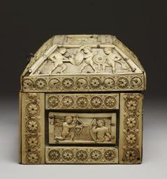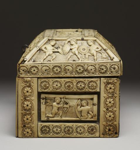 Keywords: Byzantine - Casket with Images of Cupids - Walters 71298 - Left Side.jpg This finely carved ivory casket is decorated with curly-haired erotes cupids in the guise of warriors dancers and musicians The lid shows two in equestrian combat while the trapezoidal panel in front shows a group of four erotes and a centaur dancing and playing musical instruments The rectangular plaque on the casket's front features an eros playing a harp on a stand a chariot drawn by panthers and two other erotes playing musical instruments century 10 Medieval bone ivory wood cm 12 6 18 5 13 5 accession number 71 298 31653 Bought in Italy Edward Joseph London ca 1888 by purchase Sale Christie's London May 6 1890 no 1003 and February 1894 no 357 Isaac Falcke London 1894 by purchase Sale Christie's London April 19 1910 no 166 Jacques Seligmann Paris 1910 by purchase Henry Walters city Baltimore Walters Art Museum Henry Walters Acquired by Henry Walters 1910 Early Christian and Byzantine Art Baltimore Museum of Art Baltimore 1947 Ivory The Sumptuous Art The Walters Art Gallery Baltimore 1983-1984 The Taste of Maryland Art Collecting in Maryland 1800-1934 The Walters Art Gallery Baltimore 1984 place of origin Constantinople present-day Istanbul Turkey Walters Art Museum license Byzantine ivory in the Walters Art Museum Decorative and applied arts of Byzantine Empire Media contributed by the Walters Art Museum needs category review |