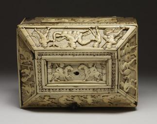 Keywords: Byzantine - Casket with Images of Cupids - Walters 71298 - Top.jpg This finely carved ivory casket is decorated with curly-haired erotes cupids in the guise of warriors dancers and musicians The lid shows two in equestrian combat while the trapezoidal panel in front shows a group of four erotes and a centaur dancing and playing musical instruments The rectangular plaque on the casket's front features an eros playing a harp on a stand a chariot drawn by panthers and two other erotes playing musical instruments century 10 Medieval bone ivory wood cm 12 6 18 5 13 5 accession number 71 298 31653 Bought in Italy Edward Joseph London ca 1888 by purchase Sale Christie's London May 6 1890 no 1003 and February 1894 no 357 Isaac Falcke London 1894 by purchase Sale Christie's London April 19 1910 no 166 Jacques Seligmann Paris 1910 by purchase Henry Walters city Baltimore Walters Art Museum Henry Walters Acquired by Henry Walters 1910 Early Christian and Byzantine Art Baltimore Museum of Art Baltimore 1947 Ivory The Sumptuous Art The Walters Art Gallery Baltimore 1983-1984 The Taste of Maryland Art Collecting in Maryland 1800-1934 The Walters Art Gallery Baltimore 1984 place of origin Constantinople present-day Istanbul Turkey Walters Art Museum license Byzantine ivory in the Walters Art Museum Decorative and applied arts of Byzantine Empire Media contributed by the Walters Art Museum needs category review |
