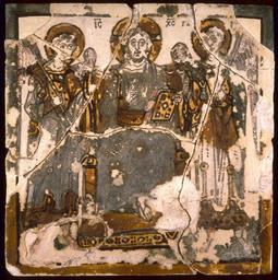 Keywords: Byzantine - Christ Enthroned Between Two Archangels - Walters 4820865.jpg Like an emperor surrounded by his officials Christ is shown here seated on a throne and flanked by the two archangels Michael and Gabriel dressed in Byzantine court costume He blesses with one hand and holds a Gospel book in the other Although of unknown origin this tile is very similar to ones known to have been made in the Byzantine capital Constantinople now Istanbul century 10 Medieval ceramic with glaze cm 17 1 16 8 0 9 accession number 48 2086 5 21546 Nikos Avgheris Istanbul ca 1950 by purchase Robert E Hecht Ruxton Maryland 1956 by purchase Walters Art Museum 1956 by purchase Partial museum purchase with funds provided by the S A P Fund 1956 and partial gift of Mr Robert E Hecht Jr 1957 place of origin Constantinople present-day Istanbul Turkey Walters Art Museum license 2D Byzantine and Early Russian art in the Walters Art Museum Byzantine art Media contributed by the Walters Art Museum needs category review |