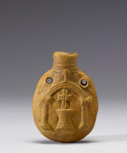| Keywords: Byzantine - Pilgrim Flask - Walters 482521 - Back.jpg  This flask shows a shrouded figure perhaps Lazarus emerging from the partially opened doors of a tomb On the reverse is a cross under an arch These two images evoked the pilgrim's belief in Christ's victory over death and the final resurrection of all believers The flask could be worn around the neck as a kind of protective souvenir century 6 7 Late Antique terracotta cm 6 8 4 9 2 2 accession number 48 2521 19490 Clive Foss Boston by purchase Walters Art Museum 1985 by purchase Museum purchase 1985 King Herod's Dream Caesarea on the Sea Natural History Museum of Los Angeles Los Angeles; Denver Museum of Natural History Denver; Science Museum of Minnesota St Paul; Museum of Science Boston Boston; Canadian Museum of Civilization Gatineau; Smithsonian National Museum of Natural History Washington 1988-1990 Memory and the Middle Ages McMullen Museum of Art Boston College Chestnut Hill 1995 place of origin Ephesus in present-day Turkey Walters Art Museum license Ancient Roman art in the Walters Art Museum Decorative and applied arts of Byzantine Empire Media contributed by the Walters Art Museum needs category review |
