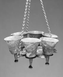 | Keywords: Byzantine - Polycandelion with Glass Lamps - Walters 542466 - View A.jpg  Whether in a church adorned with stained-glass windows or in a space with only small openings in the walls the light entering from outside would have mingled with flickering oil lamps and candles inside illuminating some areas of painted or mosaic-clad walls while leaving other spaces dark Candles were set into candlesticks placed on altars and on the floor supported by holders affixed to columns and wall Oil lamps could be suspended between the columns lining the nave or over the altar This example of a Byzantine chandelier or polycandelion Greek for many lights made around the seventh century consists of an openwork bronze disk with holes for seven glass lamps one in the center and six surrounding it Referring to the church of Hagia Sophia in Constantinople illuminated with similar hanging lamps the poet Paul the Silentiary wrote in 563 No words are sufficient to describe the illumination in the evening You might say that some nocturnal sun filled the majestic church with its light century 6 8 Late Antique bronze with traces of enamel or glass H of polycandelion with lamps and chain 18 7/16 x Diam 9 11/16 in 46 9 x 24 6 cm ; H of chain cm 41 ; H of each lamp ranges from 4 5/8 to 5 5/16 in 11 7 to 13 5 cm ; Diam of lamp cm 9 6 ; H of lamp stem cm 5 9 accession number 54 2466 21719 Heidi Vollmoeler Zurich by purchase Walters Art Museum 1965 by purchase Museum purchase 1965 3000 Years of Glass Treasures from The Walters Art Gallery The Walters Art Gallery Baltimore 1982 Lighting in Early Byzantium Dumbarton Oaks Washington 1984-1985 place of origin Eastern Mediterranean Walters Art Museum license Polycandela Decorative and applied arts of Byzantine Empire Byzantine and Early Russian art in the Walters Art Museum |