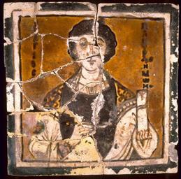 Keywords: Byzantine - Saint Panteleimon - Walters 4820864.jpg Panteleimon a physician who became a saint through his great charity for the poor miracles and martyrdom is shown here with a lancet in his right hand This tile is one among three in the Walters Art Museum that have the same size and contain identical busts of male saints the other two depict Saint Basil inv 48 2086 17 and Saint Arethas inv 48 2086 2 The series probably formed a frieze on a church wall or altar screen century 10 Medieval ceramic with glaze cm 17 1 17 3 0 9 accession number 48 2086 4 26666 Nikos Avgheris Istanbul ca 1950 by purchase Robert E Hecht Ruxton Maryland 1956 by purchase Walters Art Museum 1956 by purchase Partial museum purchase with funds provided by the S A P Fund 1956 and partial gift of Mr Robert E Hecht Jr 1957 place of origin Constantinople present-day Istanbul Turkey Walters Art Museum license 2D Byzantine and Early Russian art in the Walters Art Museum Icons in ceramic Byzantine art Icons of Saint Pantaleon |