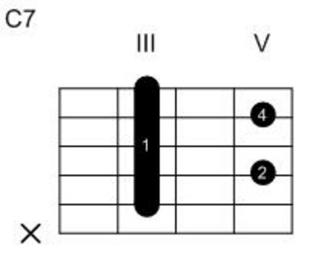 Keywords: C-Dur-7 Barré.jpg Eigenanfertigung 2005-12-01 own assumed Red Rooster Guitar chords in standard tuning