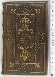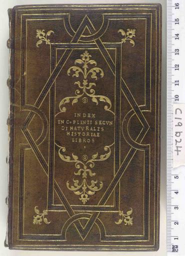 | Keywords: C. Plinii Secundi Naturalis Historiae prima (-tertia) pars. 4 vols. - Upper cover (c19b24).jpg  Style Interlacing ribbon/strapwork Mottoes; Caption Upper cover; Colour Brown; Edge Unspecified exhibition history Decorative Technique Tooled in gold Painted; Cover Material Goatskin includes morocco turkey etc c 1540 Paris bound for J Grolier by Jean Picard Volume described by H M Nixon Bookbindings from the library of Jean Grolier p 27 n 44-47 ; see A Hobson Renaissance book collecting Appendix I Grolier's bindings classified by workshop pp 223-229 IV France 1538-1547 c Jean Picard i With solid or open tools p 226 object history Text 1536 1535 1538; Venice; Grolier Jean 1479-1565 object type Cc-zero place of creation Binding France place of discovery Unspecified British Library image http //www bl uk/catalogues/bookbindings/LargeImage aspx RecordId 020-000006784 ImageId ImageId 42997 Copyright BL C Plinii Secundi Naturalis Historiae prima -tertia pars 4 vols Uploaded with GWToolset C Plinii Secundi Naturalis Historiae prima -tertia pars 4 vols - Upper cover c19b24 http //www webarchive org uk/bldatasets/bindings/7542_4 jpg Bookbinding 16th-century bookbinding British Library Bookbindings |