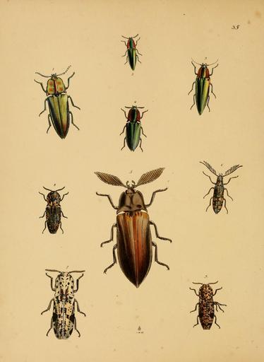 | Keywords: CabinetOrientalEntomology35.jpg  en ORDER ”COLEOPTERA Section ”Pentamera Family ” Elateridae FIGURE I ”CAMPSOSTERNUS TEMPLETONII Westw Campsosternus viridi-aeneus ; pronoto lateribus marginatis cyaneis ante meJium jiarum Binuatis disco depresso cuprescenti carina media longitudinali elevata loete puiiiurca nitiJissima aiigulis posticis etiam purpureis eljlris subconvcxis postice magis cupreis sutura marginibuscjue latoralibus cyancscentibus disco sub Icnte granulosis striisque noTcm in singulo fere obliteratis ; corpore subtus cyaneo-purpurascenti lateribus tboracis et metasterni abdomineque magis cupreis antemiis pedibusque chalybseis Campsosternus brassy green ; the sides of the pronotum margined and cyaneous and slightly sinuated before the middle with a small excavation on each side beyond the middle the disk depressed and coppery having a rather raised longitudinal central carina of rich glossy purple the hind angles also purple ; the elytra rather convex rather more coppery beyond the middle the suture and lateral margins cyaneous the disk seen tlu'ough a lens is very finely granulose and each elytron has nine very fine stria; scarcely visible ; the body beneath is purple-cyaneous with the sides of the thorax and mesosternum and the abdomen more coppery ; the autennae and legs chalybeous Length of the insect 1 and 5/6 inch Inhabits Ceylon In the Collection of R Templeton Esq FIGURE 2 ”CAMPSOSTERNUS DOHRNII Westw Campsosternus feneus elytris magis auratis capite inter oculos bicanaliculato antennis brevioribus cyaneis ; pronoto convexo glaben-imo lateribus ante medium vi \ sinuatis rufo-purpureis disco ante marginem posticum bi-irapresso elytris glabris sub lente pimctis minutis impressis et ad basin sti-iis impressis notatis ; corpore subtus concolori pedibus nigro-aeneis Campsosternus brassy with the elytra more golden coloured ; the head is marked with two longitudinal impressions between the eyes ; the antennte rather short and cyaneous ; the pronotum convex and very glossy ; the sides before the middle are scarcely sinuated and are purplish-red ; the brassy disk has two impressions preceding the posterior margin ; the elytra are glossy and impressed with minute punctures visible only un der a lens ; the base is marked with several short deeper longitudinal strice ; the hody is coloured beneath as above ; the legs are brassy black Length of the insect nearly 1 inch Inhabits Assam Communicated by Major -Jenkins Named in honour of the President of the Entomological Society of Stettin FIGURE 3 ”CAMPSOSTERNUS STEPHENSII HOPE in Zool Journ p 25 Campsosternus postice valde acuminatus supra viridi-auratus Isevis capite punctate facie impressione ovali profunda pronoto impressionibus duabus obUquis prope medium mai-ginis postici lateribus integris vitta lata ferruginea margine ipso elevate teneo subtus aurato-aeneus nitidissimus prothoracis lateribus ferrugineo-rittatis pedibus aureo-asneis Campsosternus very much attenuated posteriorly above golden green smooth the head punctured the face with a deep oval impression ; the pronotum with the sides entii-e and with two oblique impressions near the middle of the posterior margin the sides with a broad femiginous baud the margin itself being elevated and brassy ; beneath brassy gold-coloured and very glossy ; sides of the prothorax broadly banded with ferruginous ; the legs brassy-golden Elytra deeply impressed at the base Length of the insect nearly I and 1/2 inch Inhabits Nepaul Gen Hardwicke In the Collection of the British Museum FIGURE 4 ”CAMPSOSTERNUS HOPEI Westw Campsosternus latus nitidissimus supra cyaneo-raidis elytris basi parum punctato-striatis ; capite nigro occipite eoncavo ; lateribus prothoracis pm-pureo late ˘ittatis mai-ginatis integris; corpore subtus cyaneo nitidissimo lateribus thoracis et abdominis purpureo-tinctis; pedibus cyaneis femoribus castaneo-ruiis Campsostemus broad convex and very glossy; above blue-green elytra at the base sUghtly punctate- striate the head black with the crown concave ; the sides of the prothorax broadly banded n-ith reddish-purple margined and entire ; body beneath cyaneous very glossy the sides of the thorax and abdomen tinged with purple ; legs cyaneous thighs chestnut-red Length of the insect 1 and 1/2 inch Inhabits Tennasserim In the British Museum FIGURE 5 ”OXYNOPTERUS CUMINGII Hope In Proc Zool Soc 1842 p 77 Oxynopterus fusco-nigricans capite et pronoto pubescentia brevl grisea indutis antennis ferrugineis capitis clypeo rotundato atro medio disci subsulcato ; prothorace fusco margmibus elevatis angulis anticis parum productisposticis acutis et extus divergentibus ; scutello postice rotundato atro ; elytris acuminatis fusco-flavis lineis tribus panira elevatis corpore infra atropiceo femoribus concoloribus mesosterno fortiter excavato cornu prosterni ad pedes medios extenso Foemina major antennis simplicibus Oxynopterus blaekish-bro\vii head and prothorax clothed with short grey pubescence antennEe ferraginous clypeus of the head rounded black ; the middle of the disc subsulcated ; prothorax bro\\'n with the lateral margins elevated the anterior angles somewhat produced the hind ones acute and extended outwardly the scutellum rounded behind and black the elyti-a acuminate at the tips fulvous-brown with three slightly elevated lines the body beneath pitchy-brown the thighs of the same colovir the mesosternum strongly excavated the prosternal spine extending to the middle feet The female is about a quarter of an inch larger and has simple antennce Length of the insect about 3 inches Inhabits the PhiUppine Islands Mr Cuming In the British Museum FIGURE 6 ”PECTOCERA MELLII Hope Op Cit p 79 Pectocera flavo-fusca griseo variegatus ; antennis pectinatis prothorace subtomentoso angulis posticis acutis elytris postice valde acuminatis ; pedibus flavo-fuscis et pubescentibus Pectocera yellowish-brown variegated with grey the antennae pectinated the pectinations 