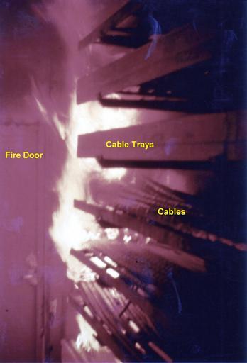 Keywords: Cable tray fire sweden.jpg Image 2 of 5 of governmental fire test in Sweden This small fire house was loaded with cable trays full of cables These were connected between the floors causing cable penetrations between fire compartments When the penetrants were installed the government invited their local firestop manufacturers to install their products Kindling was placed below the trays These kindling blocks were set on fire The fire quickly engulfed all trays Results were mixed An enormous amount of smoke was generated before the fire was extinguished Trays twisted and buckled Own 2007-05-19 Achim Hering Fire Cable trays Electric cables Fire testing Fire doors |