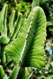 Keywords: dsc01829 cactus ile de la réunion iledelaréunion la reunion island lareunionisland st gilles les bains stgilleslesbains jardin d'eden jardindeden 2013 sony nex-3 sonynex3 sel1855 974 euphorbia grandialata euphorbiagrandialata organic pattern pattern plant foliage leaf texture outdoor depth of field "A cactus (plural: cacti, cactuses, or cactus) is a member of the plant family Cactaceae, within the order Caryophyllales. The word "cactus" derives, through Latin, from the Ancient Greek κάκτος (kaktos), a name originally used for a spiny plant whose identity is not certain. Cacti are native to the Americas, ranging from Patagonia in the south to parts of western Canada in the north—except for Rhipsalis baccifera, which also grows in Africa and Sri Lanka. Most cacti live in habitats subject to at least some drought. Many live in extremely dry environments, even being found in the Atacama Desert, one of the driest places on earth. Cacti show many adaptations to conserve water. Most species of cacti have lost true leaves, retaining only spines, which are highly modified leaves. As well as defending against herbivores, spines help prevent water loss by reducing air flow close to the cactus and providing some shade. Cactus spines are produced from specialized structures called areoles, a kind of highly reduced branch. Areoles are an identifying feature of cacti. As well as spines, areoles give rise to flowers, which are usually tubular and multipetaled. In the absence of leaves, enlarged stems carry out photosynthesis. Unlike many other succulents, the stem is the only part of most cacti where this vital process takes place. Cactus stems also store water, and are often ribbed or fluted, which allows them to expand and contract easily. Cacti occur in a wide range of shapes and sizes. The tallest free-standing cactus is Pachycereus pringlei, with a maximum recorded height of 19.2 m (63 ft), and the smallest is Blossfeldia liliputiana, only about 1 cm (0.4 in) in diameter at maturity. The smaller cacti usually have globe-shaped stems, combining the highest possible volume with the lowest possible surface area. Many cacti have short growing seasons and long dormancies, and are able to react quickly to any rainfall, helped by an extensive but relatively shallow root system. A fully grown saguaro (Carnegiea gigantea) is said to be able to absorb as much as 200 US gallons (760 l; 170 imp gal) of water during a rainstorm. Like other succulent plants, most cacti employ a special mechanism called "crassulacean acid metabolism" (CAM) as part of photosynthesis. Transpiration, during which carbon dioxide enters the plant and water escapes, does not take place during the day at the same time as photosynthesis, but instead occurs at night. The plant stores the carbon dioxide it takes in as malic acid, retaining it until daylight returns, and only then using it in photosynthesis. Because transpiration takes place during the cooler, more humid night hours, water loss is significantly reduced. A few species differ significantly in appearance from most of the family. At least superficially, plants of the genus Pereskia resemble other trees and shrubs growing around them. They have persistent leaves, and when older, bark-covered stems. Their areoles identify them as cacti, and in spite of their appearance, they, too, have many adaptations for water conservation. Pereskia is considered close to the ancestral species from which all cacti evolved. In tropical regions, other cacti grow as forest climbers and epiphytes (plants that grow on trees). Their stems are typically flattened, almost leaf-like in appearance, with fewer or even no spines, such as the well-known Christmas cactus or Thanksgiving cactus (in the genus Schlumbergera). Cacti have a variety of uses: many species are used as ornamental plants, others are grown for fodder or forage, and others for food (particularly their fruit). Cochineal is the product of an insect that lives on some cacti. Source: Wikipedia "A cactus (plural: cacti, cactuses, or cactus) is a member of the plant family Cactaceae, within the order Caryophyllales. The word "cactus" derives, through Latin, from the Ancient Greek κάκτος (kaktos), a name originally used for a spiny plant whose identity is not certain. Cacti are native to the Americas, ranging from Patagonia in the south to parts of western Canada in the north—except for Rhipsalis baccifera, which also grows in Africa and Sri Lanka. Most cacti live in habitats subject to at least some drought. Many live in extremely dry environments, even being found in the Atacama Desert, one of the driest places on earth. Cacti show many adaptations to conserve water. Most species of cacti have lost true leaves, retaining only spines, which are highly modified leaves. As well as defending against herbivores, spines help prevent water loss by reducing air flow close to the cactus and providing some shade. Cactus spines are produced from specialized structures called areoles, a kind of highly reduced branch. Areoles are an identifying feature of cacti. As well as spines, areoles give rise to flowers, which are usually tubular and multipetaled. In the absence of leaves, enlarged stems carry out photosynthesis. Unlike many other succulents, the stem is the only part of most cacti where this vital process takes place. Cactus stems also store water, and are often ribbed or fluted, which allows them to expand and contract easily. Cacti occur in a wide range of shapes and sizes. The tallest free-standing cactus is Pachycereus pringlei, with a maximum recorded height of 19.2 m (63 ft), and the smallest is Blossfeldia liliputiana, only about 1 cm (0.4 in) in diameter at maturity. The smaller cacti usually have globe-shaped stems, combining the highest possible volume with the lowest possible surface area. Many cacti have short growing seasons and long dormancies, and are able to react quickly to any rainfall, helped by an ex