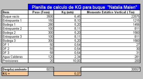 Keywords: CalculoKG.PNG spread sheet for KG calculation transversal stability Own 2007-01 Claudio Elias Naval architecture