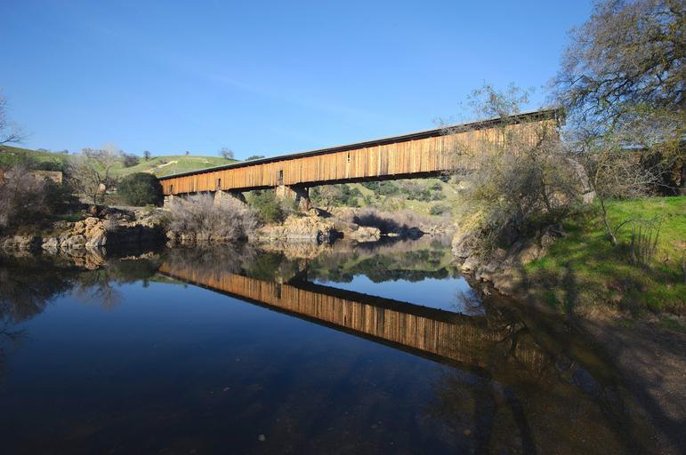 Keywords: california covered bridge historical landmark reflections summer spring river stream water nature outside sky trees architecture beautiful