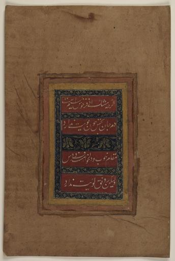 | Keywords: Calligraphic fragment in nasta'liq.jpg en Calligraphic fragment executed in nasta'liq script in white ink on red background It includes four lines of Persian poetry describing the heavenly scent and life-endowing capabilities of the beloved The verses read Agar cha mushk-i az far khush nasim ast / Dam-i jan bakhsh chun buyat nadarad / Maqam-i khub u dilkhwah-st firdaws / Valikin runaq-i kuyat nadarad Although musk smells fragrant / It does not breathe life like your scent / Paradise is a good and beloved place / But it is not as splendid as your abode Blue panels decorated with gold flower and leaf motifs separate and frame the lines of text The dimensions of the written surface are 8 w x 14 h cm http //memory loc gov/cgi-bin/ampage collId ascs fileName 050/ascs050 db recNum 0 itemLink D ascsbib 260 /temp/~intldl_eEP1 Library of Congress Selections of Arabic Persian and Ottoman Calligraphy century 18 Munshi Ram attr PD-Art Nastaliq Library of Congress Arabic Persian and Ottoman calligraphy collection Poems in Persian Persian manuscripts Persian calligraphy |