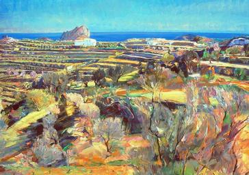 Keywords: outdoor spain españa blanca costa calpe peñon-de-ifach peñondeifach rock sea mediterranean hubertine-heijermans hubertineheijermans artistpainter 1998 on.canvas oncanvas Calpe is a Mediterranean fishing harbor one passes when going south towards Alicante. A large rock called 'Peñon of Ifach' at the entrance of the harbor protects to the North. The land behind the harbor rises steeply, before it stretches out into lush olive groves and terraces with vineyards as far as the eye can see. A small part underneath with a vineyard and the artist's signature are missing. en.wikipedia.org/wiki/Calp En français: Calpe est un port de pêche bien protégé derrière un grand rocher du nom de Peñon de Ifach. Le pays autour consiste de terrasses couvertes d'oliveraies, des vergers d'amandiers. On se trouve dans la Province d'Alicante. Calpe is a Mediterranean fishing harbor one passes when going south towards Alicante. A large rock called 'Peñon of Ifach' at the entrance of the harbor protects to the North. The land behind the harbor rises steeply, before it stretches out into lush olive groves and terraces with vineyards as far as the eye can see. A small part underneath with a vineyard and the artist's signature are missing. en.wikipedia.org/wiki/Calp En français: Calpe est un port de pêche bien protégé derrière un grand rocher du nom de Peñon de Ifach. Le pays autour consiste de terrasses couvertes d'oliveraies, des vergers d'amandiers. On se trouve dans la Province d'Alicante.
