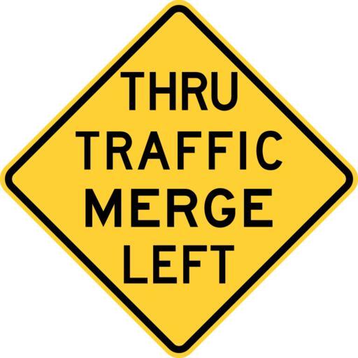Keywords: Caltrans W74.svg Caltrans W74 CA THRU TRAFFIC MERGE LEFT sign Self made based on Caltrans sign drawing 2009-04-05 own assumed Overpush~commonswiki Diagrams of road signs of California Merge signs