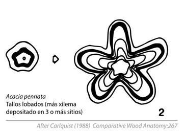 | Keywords: Cambial Variants (Anomalous Secondary Growth) Fig. 8.5.2 Acacia pennata.svg en Fig 8 5 Diagrammatic representations showing ontogenetic sequences in cambia that have normal products phloem to outside xylem to inside but abnormal conformation Cambium produces more xylem in some places than others to achieve flattened or lobed stems Grooved xylem results from cambium that acts unilaterally little or no xylem in grooves Phaedranthus ; progressively unilateral activity may expand along margins of grooves resulting in ledged zig-zag appearance Passiflora Presence of xylem plates separated by rays results from sluggish cambial activity in ray areas in Fig 8 4 Conventions for this and other figures in this chapter black phloem blank with circles indicating vessels xylem; stippled axial parenchyma vertical or variously diagonal lines in pairs rays 1988-01-01 S Carlquist 1988 p 267 Fig 8 5 Chapter 8 Cambial Variants Anomalous Secondary Growth In Comparative Wood Anatomy Part of the series Springer Series in Wood Science Springer Verlag Berlin Heidelberg S Carlquist 1988 other versions Custom license marker 2016 05 08 Tracing data from a scientific diagram taken from primary scientific literature not the scope of copyright laws PD-ineligible Equivalent to cc-0 Wood anatomy Acacia pennata |