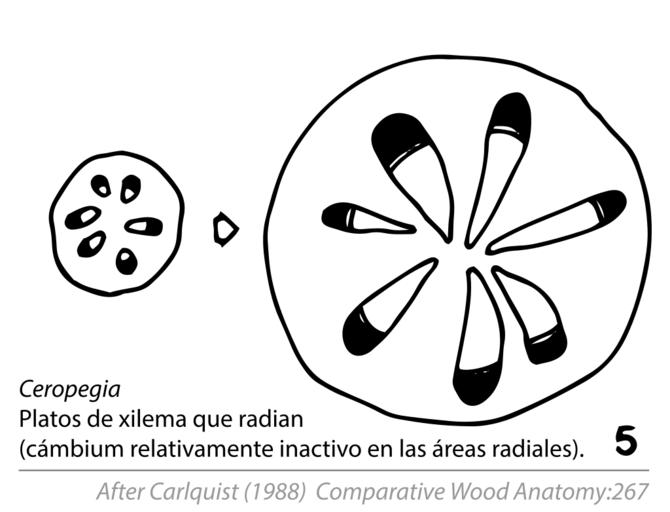 | Keywords: Cambial Variants (Anomalous Secondary Growth) Fig. 8.5.5 Ceropegia.svg en Fig 8 5 Diagrammatic representations showing ontogenetic sequences in cambia that have normal products phloem to outside xylem to inside but abnormal conformation Cambium produces more xylem in some places than others to achieve flattened or lobed stems Grooved xylem results from cambium that acts unilaterally little or no xylem in grooves Phaedranthus ; progressively unilateral activity may expand along margins of grooves resulting in ledged zig-zag appearance Passiflora Presence of xylem plates separated by rays results from sluggish cambial activity in ray areas in Fig 8 4 Conventions for this and other figures in this chapter black phloem blank with circles indicating vessels xylem; stippled axial parenchyma vertical or variously diagonal lines in pairs rays 1988-01-01 S Carlquist 1988 p 267 Fig 8 5 Chapter 8 Cambial Variants Anomalous Secondary Growth In Comparative Wood Anatomy Part of the series Springer Series in Wood Science Springer Verlag Berlin Heidelberg S Carlquist 1988 other versions Custom license marker 2016 05 08 Tracing data from a scientific diagram taken from primary scientific literature not the scope of copyright laws PD-ineligible Equivalent to cc-0 Wood anatomy Ceropegia |