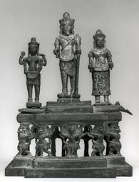 Keywords: Cambodian - Pedestal with Deities - Walters 542715.jpg This interesting object is an amalgamation but an amalgamation of long standing The oldest part is the lower base with lion supports This was originally the lowermost part of an altarpiece The two main figures Shiva and Lakshmi wear garments with attached floral medallions Siva holds a trident in his left hand and a rosary in his right Lakshmi holds two lotuses The third element is the Vishnu at left Physical evidence indicates that it was added to the ensemble in recent times Base 1101-1150; Right figures 1180-1220; Left figure 12th-13th century Khmer; Right figures Bàyon solid cast bronze leaded bronze cm 22 5 15 5 accession number 54 2715 16860 Thailand Alexander B Griswold Monkton probably 1949 presented to the Breezewood Foundation November 7 1956 inv no 409 Walters Art Museum Henry Walters Bequest of A B Griswold 1992 none Unearthly Elegance Buddhist Art from the Griswold Collection The Walters Art Gallery Baltimore 1995 place of origin Angkor present-day Siem Reap Cambodia Walters Art Museum license Southeast Asian art in the Walters Art Museum Sculptures from Cambodia Media contributed by the Walters Art Museum needs category review Media contributed by the Walters Art Museum needs artist review |