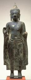 | Keywords: Cambodian - Standing Buddha - Walters 542797.jpg conj or Cambodia In the course of the 13th century images of the standing Buddha both hands performing the same gesture were not generally a part of the repertory of the Lopburi sculptors working in stone At Angkor it was different such Buddhas were made in the round ca late 13th century leaded bronze cm 36 5 ; with tang cm 40 5 accession number 54 2797 34616 Alexander B Griswold Monkton 1948 or before presented to the Breezewood Foundation December 1964 inv no 732 Walters Art Museum Henry Walters Bequest of A B Griswold 1992 none Unearthly Elegance Buddhist Art from the Griswold Collection The Walters Art Gallery Baltimore 1995 place of origin Angkor present-day Siem Reap Cambodia Walters Art Museum license Southeast Asian art in the Walters Art Museum Sculptures from Cambodia Media contributed by the Walters Art Museum needs category review |
